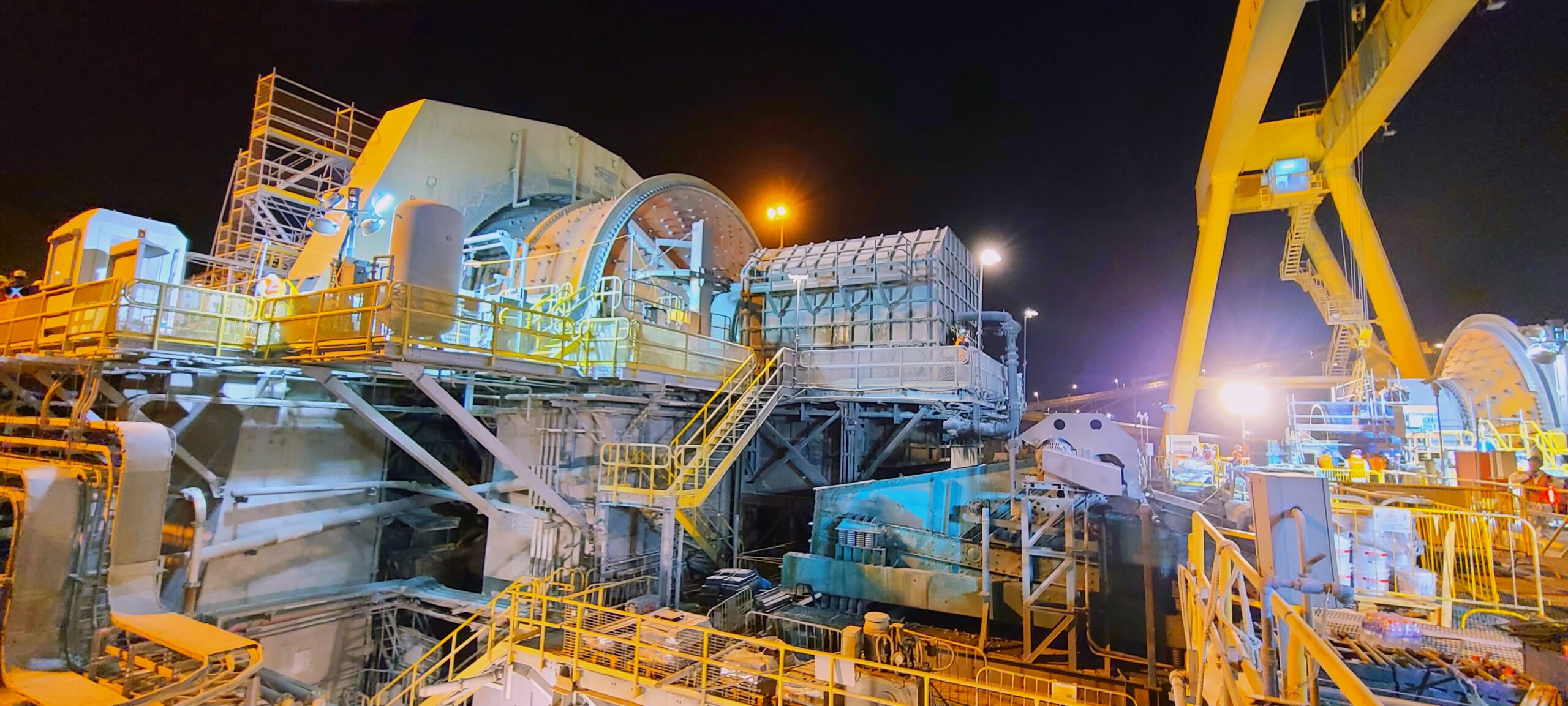 Molino SAG y los Molinos de Bolas 1 y 2, junto con su Puente Grúa realizando actividades de Mantenimiento en diferentes puntos de trabajo durante la Parada de Planta Programada, 11 de Noviembre del 2021, Montaje Electromecánico de Instrumentación de Campo y Monitoreo de Condición, Planta Concentradora Area Sulfuros, Minera Centinela, Sierra Gorda, Antofagasta, Chile.